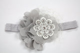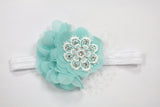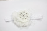 This Beautiful headband is embellished with chiffon flower and extra white lace type flower on top with Swarovski Rhinestones! Added net on the side for a spectacular look! Attached to Elastic Headband. Great for many occasions such as Birthdays, Christening, Baptism, and more! GREAT for photo shoots!