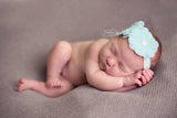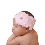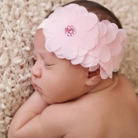 This elegant stretch headband features layered flower chiffon, making it ideal for various events including Birthdays, Christenings, Baptisms, and photo shoots. The headband is adorned with Swarovski Rhinestones at the center of the flowers, adding a touch of sparkle. It is attached to a soft elastic band for a comfortable fit.