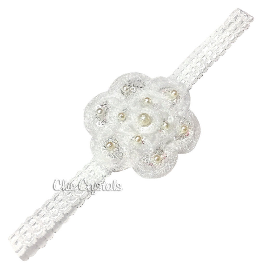This beautiful vintage looking headband is a great accessories for all baby girls. A very detailed and gorgeous design. This headband has an organza flower, embellished with pearls and sequin, attached to a soft elastic band. This piece is perfect for girls, all ages, to wear to special events such as weddings, christenings and even birthday parties. The perfect piece to complete the look!