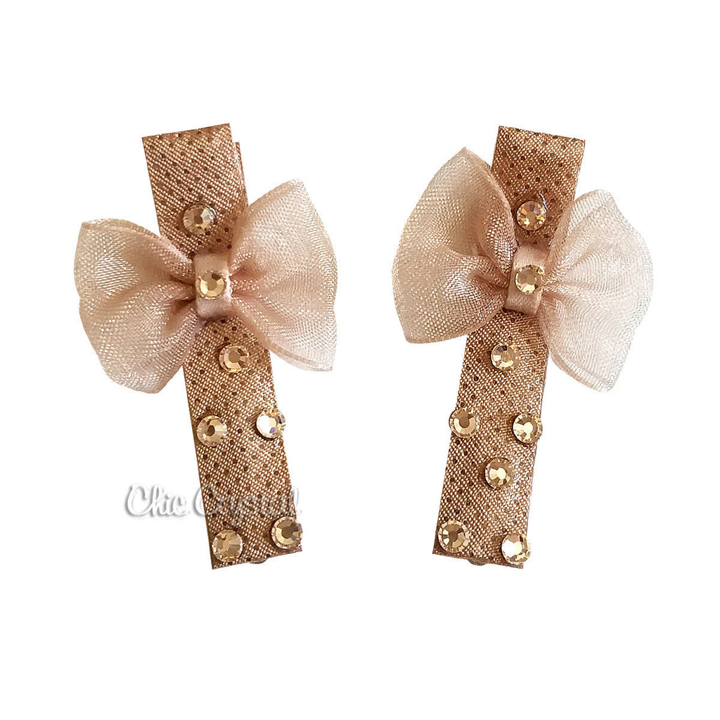 Solid color small hair bow clips. Each clip measures approximately 2 inches across, is partially lined with heat sealed ribbon, and has a small bow attached and embellished with Swarovski Rhinestones. Comes in so many colors for you to choose.