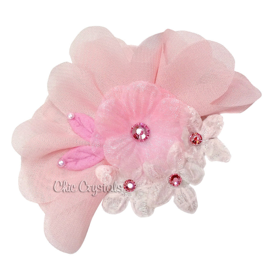 A classic piece made with chiffon, fabric flower with Swarovski Crystals and pearls attached to a clip. A very simple yet gorgeous hair clip made to perfectly fit girls of any age. With just the right amount of sparkle, it’s appropriate to wear on special occasions and also makes a perfect gift to present to a special little girl. Get this beautiful hair for your baby girl!