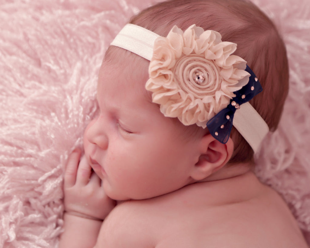 This beautiful chiffon flower embellishes a matching flexible headband made of soft stretch elastic. A pretty bow on the side is adorned with Swarovski Rhinestones, making it a charming and elegant addition for any special event and creating breathtaking photos.