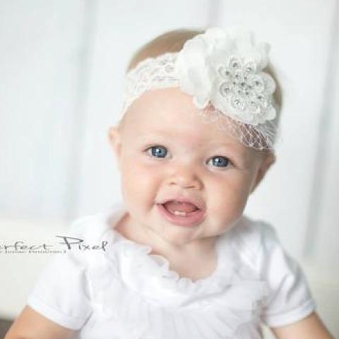 This Beautiful headband is embellished with chiffon flower and extra white lace type flower on top with Swarovski Rhinestones! Added net on the side for a spectacular look! All added on top of a soft lace headband! Such an adorable look on your little one! Make her whole outfit look amazing! Great for many occasions such as Birthdays, Christening, Baptism, and more! GREAT for photo shoots! Must have!
