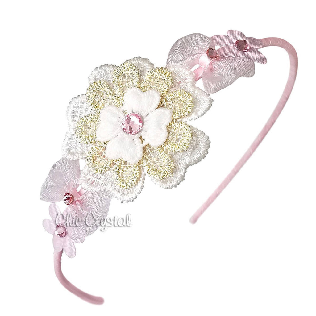 Such beautiful piece, this headband is so sparky and beautiful, handmade with bows and lace flowers on a hard headband and embellished with Swarovski crystals. Perfect for girls of all ages, can be used for so many occasions like Christening, Birthday, flower girls, wedding, special events and more. Comes in blue and pink with gold colors and can be made on a soft headband also, If interested please include in comments once you place an order.