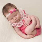 (1) Newborn romper designed for photography purposes to fit snugly on average size newborn without diaper to show off baby's form. Lace details on front, handmade with ivory lace and soft hot pink fabric.