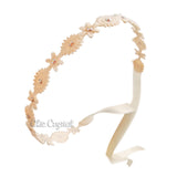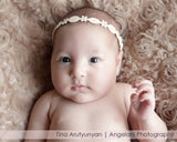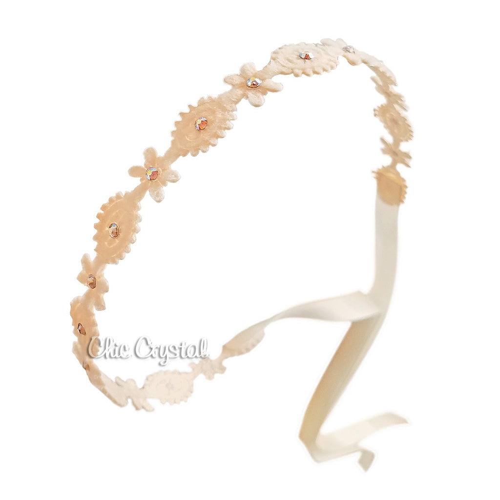 This beautiful delicate headband is perfect for newborn babies, flower girls or for your special occasion. It comes in ivory color only, Its made with gold swarovski rhinestones.