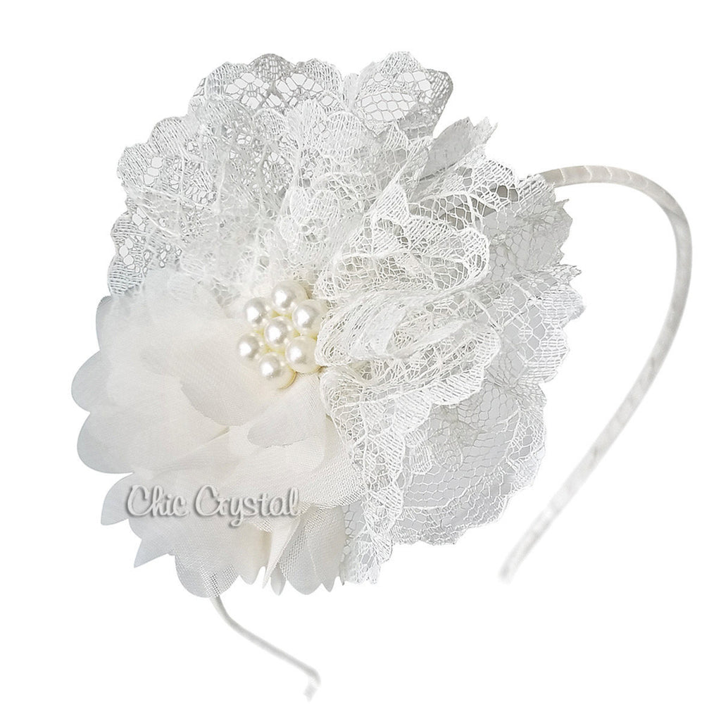This ADORABLE ivory lace hard headband will be perfect for your little Princess! Headband is embellished with lace, ivory chiffon, hard elastic band, and a pearl in the middle. Perfect for you little princess! It is great for many occasions such as birthdays, Christenings, baptisms, and great for Photo Prop.