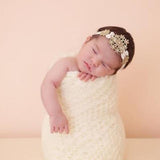 This beautiful headpiece is stunning! This headpiece has a lovely vintage flapper style flair. Its perfect for newborn baby girls, made with ivory velvet stretch band, gold lace flowers and ivory bow. Embellished with Gold Swarovski Rhinestones. Also available on a hard ivory headband