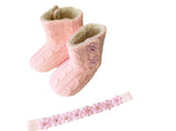 Baby boots are knitted and embellished with beautiful flowers and Swarovski rhinestones cluster in its center.