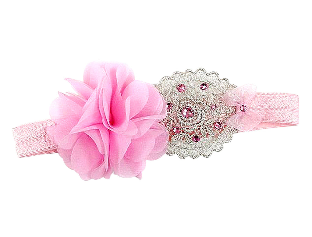 The Alison Headband is carefully handmade and features a dazzling arrangement of Swarovski rhinestones and a soft chiffon flower, making it perfect for both special occasions and everyday use. It is designed with a slim elastic band for a secure fit, providing a charming touch to brighten up any little one's day.