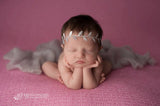 For a little pomp and pageantry, this nature-inspired gold rhinestone leaf headband is a stunning accessory for your newborn to wear for a photo shoot or for meeting family members for the first time. Custom designed in meticulous detail, it features a length of leaf ribbon trim adorned with sparkling Swarovski crystals. It has a silk ribbon along the back to make tying it onto her hair a breeze. She'll look like a Grecian princess from the moment you put it on. Most importantly, it won't snag her delicate hair and is a luxurious way to give her first baby photos an opulent flair fit for royalty. Choose from a variety of colors to match her wardrobe. This is a limited edition Chic Crystals Boutique original. Order now to guarantee availability.