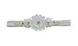 This cute flower headband is embellished with Swarovski crystals, lace flower in the middle, elastic headband and fabric material bow and flower. Great with many outfits. Use it everyday or even on birthdays, christenings, baptisms and let your princess look extra special. Great for Photo Prop!