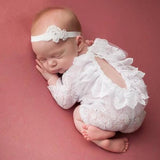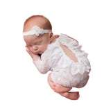 (1) Newborn romper designed for photography purposes to fit snugly on average size newborn without diaper to show off baby's form. Lace details in the back , handmade with white beautiful soft fabric