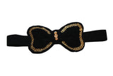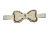 This cute bow shaped headband is made of a soft, high quality knitted felt like fabric and a shiny Swarovski crystal added in the middle. It has a beautiful gold glitter outline to it. The bow is on soft felt for comfort and attached to a soft and comfortable elastic band. Looks ADORABLE on! Great for many occasions such as birthdays, christenings, baptisms, and great for Photo Prop. Also great for everyday wear with cute dresses.