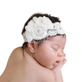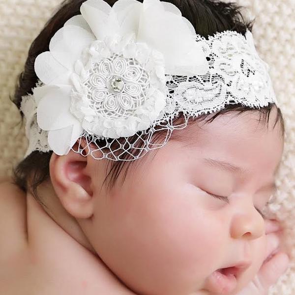 This Beautiful headband is embellished with chiffon flower and extra white lace type flower on top with Swarovski Rhinestones! Added net on the side for a spectacular look! Attached to a Lace Headband with great comfort. Great for many occasions such as Birthdays, Christening, Baptism, and more! GREAT for photo shoots!