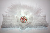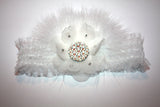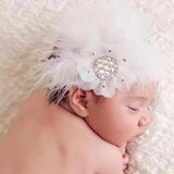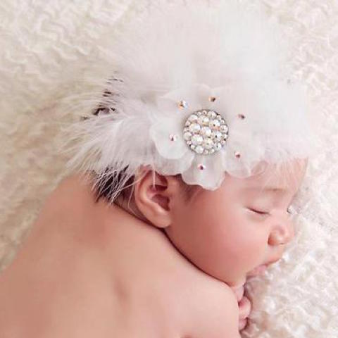 Every little princess needs a white headband like this one!!! It is really SPARKLY and SHINY! This headband is embellished with chiffon flower with LOTS of swarovski rhinestones! Feather is added on the side for a fuller and more fancy look! All attached to a soft lace material with little ruffles. Makes a gorgeous photography prop, and awesome for many special occasions. This is a must have for your babies collection