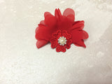 This handcrafted headband showcases a sophisticated appearance, featuring red chiffon and shimmering crystals, accented with a beautiful pearl centerpiece. Its flexible design allows for various styling options, including a clip, rigid headband, or flexible elastic headband. Perfect for celebratory occasions and special photoshoots, like Christmas and birthdays.