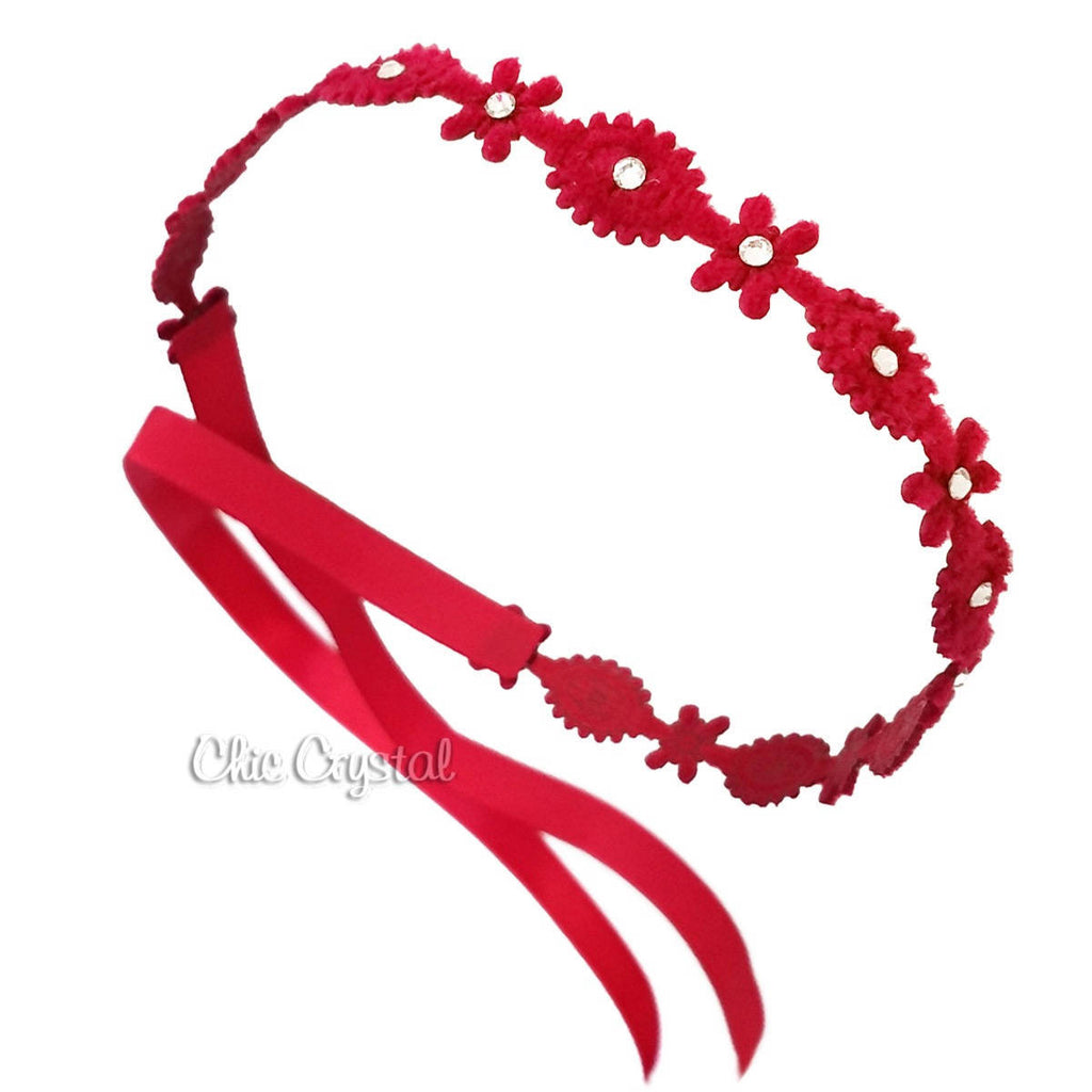 The beautiful head wrap is perfect for girls all ages. This headband can be worn by newborn babies and adults. This accessory is good for many special occasions such as birthdays, christenings, baptisms, and can even be used as a photo prop. Each flower is embellished with a sparkly Swarovski rhinestone to complete the look! The flower band is attached to a satin ribbon to help secure this accessory on the baby's head. An absolute must have!