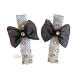 Solid color small hair bow clips. Each clip measures approximately 2 inches across, is partially lined with heat sealed ribbon, and has a small bow attached and embellished with Swarovski Rhinestones. Comes in so many colors for you to choose.