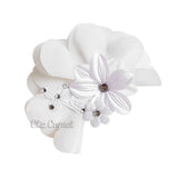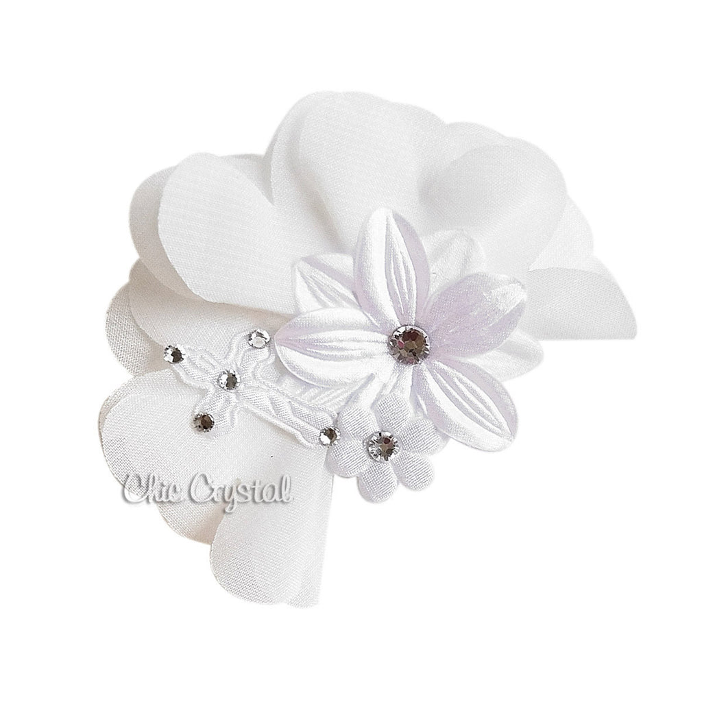 This listing is for a chiffon fabric flower headband. Flower is made of white fabric and rhinestone cross is an extremely sparkly bling accent. Flower is attached to a white thin headband. You can also choose to have the flower made into a hair clip which is attached to an alligator clip or on a hard headband thats wrapped with white ribbon (perfect for toddlers)